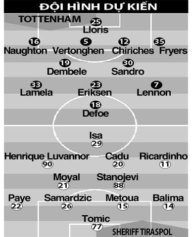 Tottenham vốn không tập trung lực lượng tốt nhất cho đấu trường Europa League. Song trước một đối thủ quá yếu như Sheriff Tiraspol, nhiều khả năng thầy trò HLV Andre Villas-Boas sẽ không mấy khó khăn giành trọn 3 điểm để đoạt vé đi tiếp.