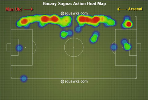 Rốt cuộc, những cơ hội rõ rệt nhất của Arsenal tới từ hàng hậu vệ, thay vì tuyến giữa như thường lệ. Ít nhất 2 lần Bacary Sagna đã băng lên và tạt bóng khá tốt từ cánh phải, nhưng các đồng đội của anh ở phía trong thậm chí còn chẳng chạm được vào bóng.